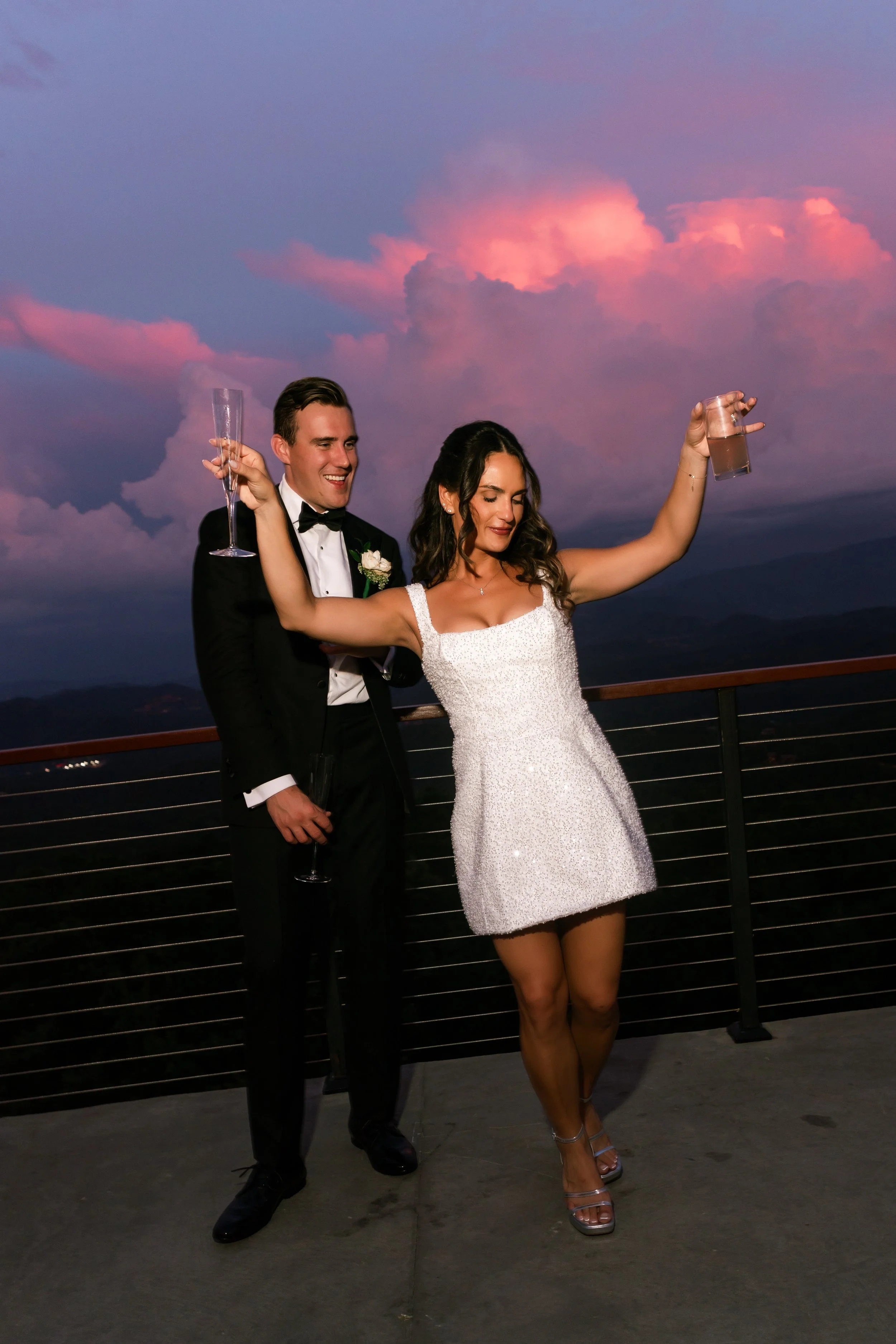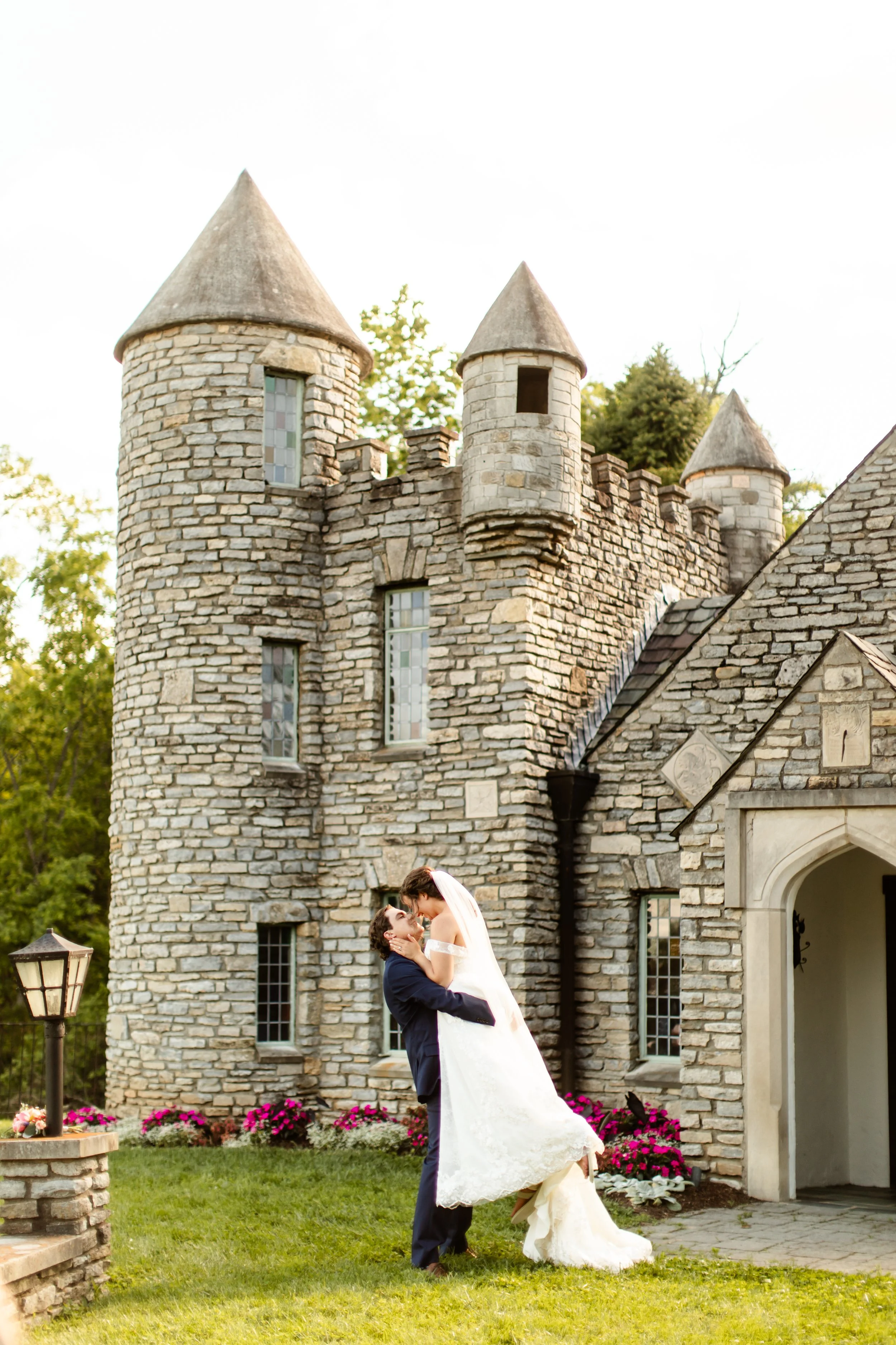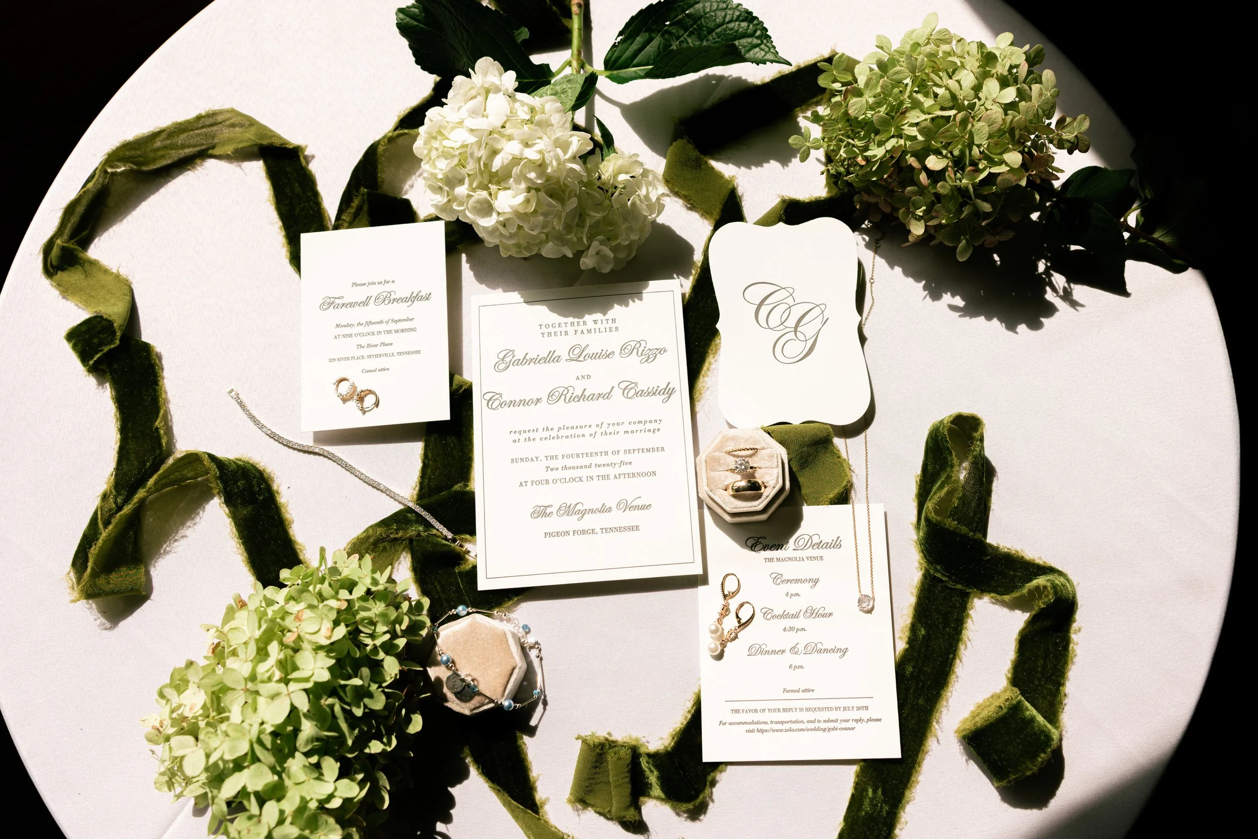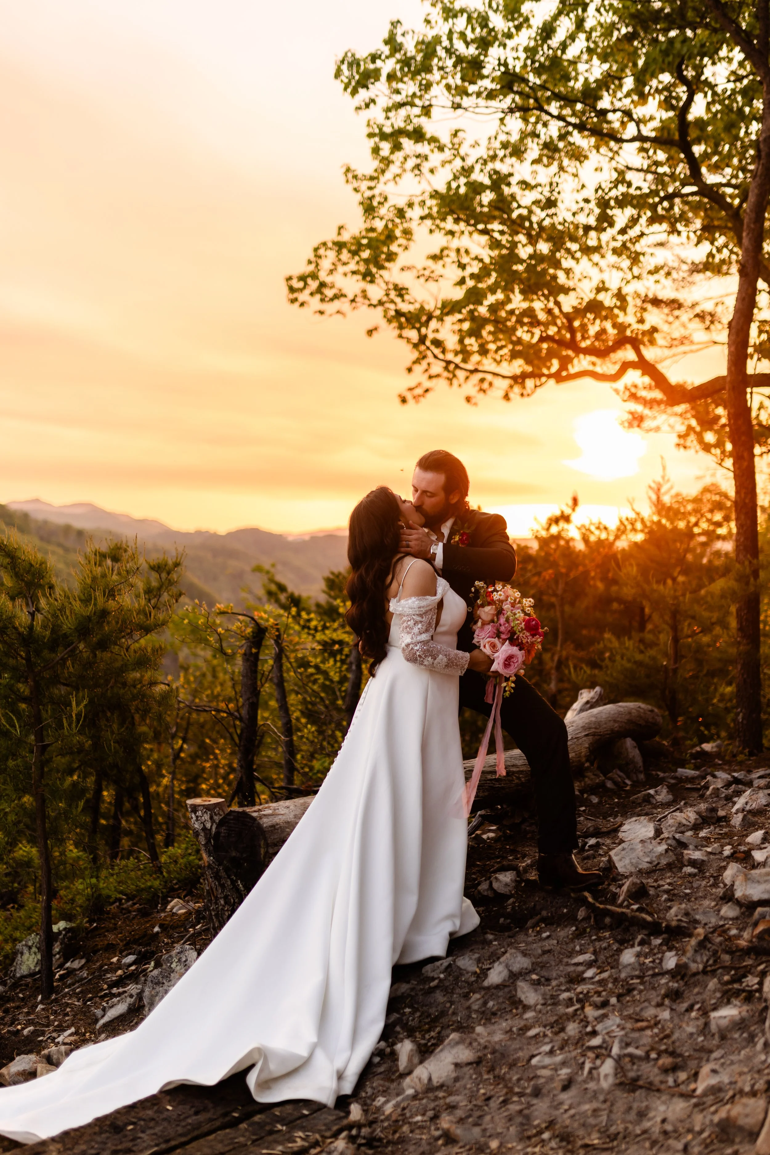A picnic setup on a lace blanket in a wooded area with a candelabra, flowers, fruit, bread, and drinks.